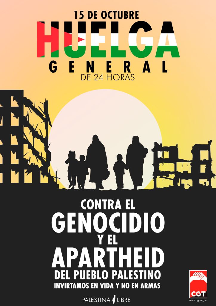 O vindeiro 15 de outubro, está convocada en todo o estado unha xornada de movilizacións e folgas contra o xenocidio e o apartheid en Palestina.