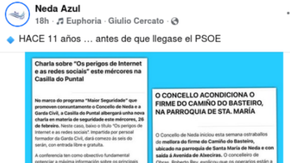 A conta semi-oficial do Partido Popular de Neda no Facebook, Neda Azul fachenda de xeito nostálxico nunha publicación das "moitas cousas que se facian" no Concello cando eles gobernaban. Pero...