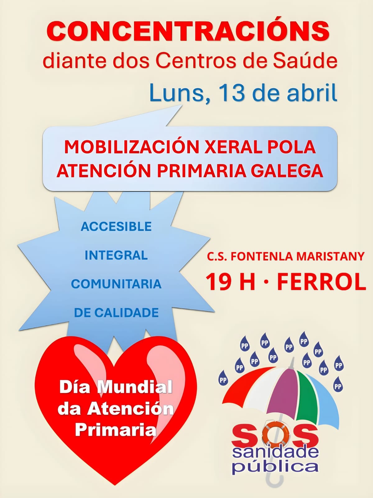 A plataforma SOS Sanidade Pública convoca unha concentración o vindeiro luns 13 de abril ás 19:00 horas diante do centro de saúde Fontenla Maristany, en Ferrol, con motivo do Día Internacional da Atención Primaria.