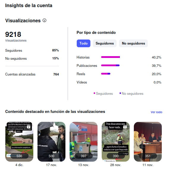 A web moveneda.org xa acumula 8.900 visitas con 650 usuarios. Pola súa banda, Facebook reflicte tamén unha evolución positiva, en liña coa web, coa que enlaza case todas as súas publicacións, cun incremento nas visualizacións e un alcance maior entre persoas que aínda non son seguidoras. En Instagram, a liña é tamen positiva con medias de visializacion 3n tre 300 e 600 nos reels e publicacións másis relevantes.
