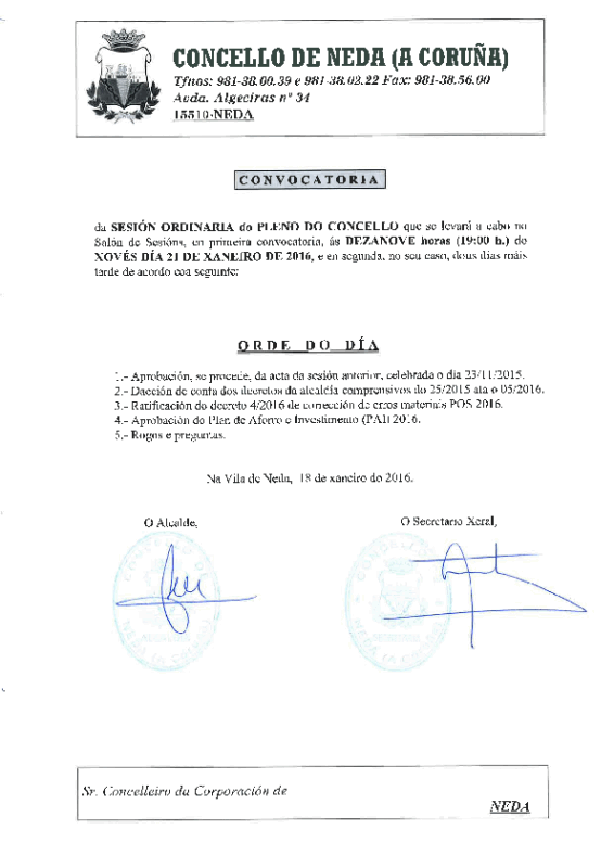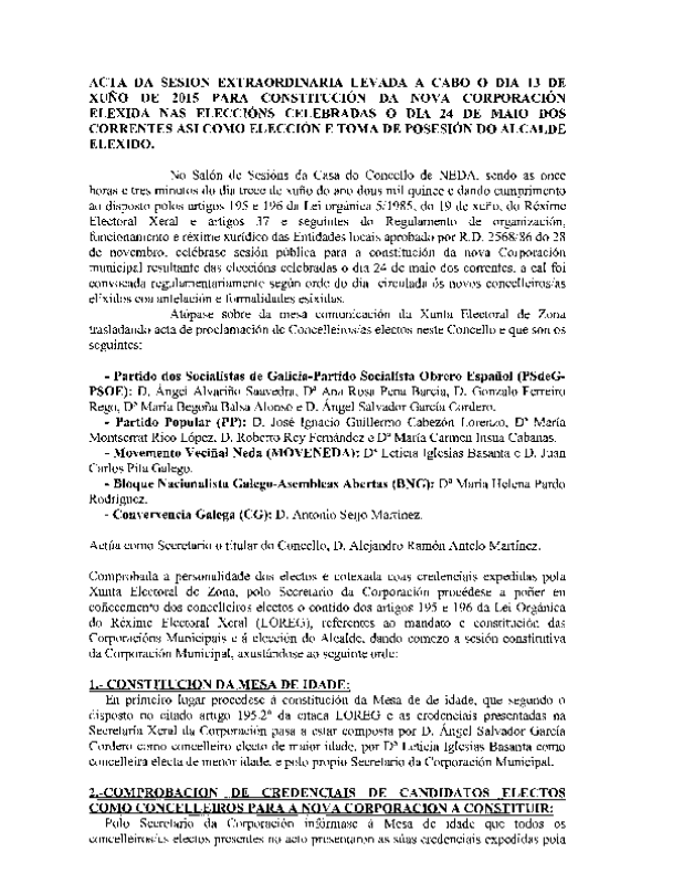 ACTA DA SESION EXTRAORDINARIA LEVADA A CABO O DIA 13 DE XUÑO DE 2015 PARA CONSTITUCIÓN DA NOVA CORPORACIÓN ELEXIDA NAS ELECCIÓNS CELEBRADAS O DIA 24 DE MAlO DOS CORRENTES ASI COMO ELECCIÓN E TOMA DE POSESIÓN DO ALCALDE ELEXIDO. No Salón de Sesións da Casa do Concello de NEDA, sendo as once horas e tres minutos do día trece de xuño do ano dous mil quince e dando cumprimento ao disposto polos artigos 195 e 196 da Leí orgánica 5/1985, do 19 de xuño, do Réxime Electoral X eral e artigos 37 e seguintes do Regulamento de organización, funcionamento e réxime xurídico das Entidades locais aprobado por R.D. 2568/86 do 28 de novembro, celébrase sesión pública para a constitución da nova Corporación municipal resultante das eleccións celebradas o dia 24 de maio dos correntes, a cal foi convocada regulamentariamente según orde do día circulada ós novos concelleiros/as elixidos coa antelación e formalidades esixidas. Atópase sobre da mesa comunicación da Xunta Electoral de Zona trasladando acta de proclamación de Concelleiros/as electos neste Concello e que son os seguintes:
