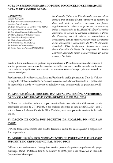 ACTA DA SESIÓN ORDINARIA DO PLENO DO CONCELLO CELEBRADA EN DATA 29 DE XANEIRO DE 2024 5o.- APROBACIÓN DO PLAN PROVINCIAL DE COOPERACIÓN ÁS OBRAS E SERVIZOS DE COMPETENCIA MUNICIPAL (PLAN ÚNICO DE CONCELLOS) “POS+ 2024” 6o.- APROBACIÓN DO PLAN POS+ADICIONAL 1/2024 PARA GASTOS SOCIAIS EXTRAORDINARIOS DO EXERCICIO 2024 7o.- MODIFICACIÓN DO REGULAMENTO DE RÉXIME INTERIOR DA EIM “OS PELEGRINS” 8o.- INCOACIÓN DO PROCEDEMENTO DE REVISIÓN DE OFICIO DO ACORDO No 6, ADOPTADO POLO PLENO O DÍA 30/01/2023 BAIXO O TÍTULO “APROBACIÓN DOS CRITERIOS DE INTERPRETACIÓN DAS NORMAS SUBSIDIARIAS DE PLANEAMENTO” 9o.- MOCIÓN DO GRUPO MUNICIPAL PP REFERIDA A CONSTRUCIÓN |