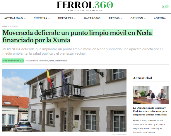 O dixital Ferrol360 recolle a proposta para que o Concello de Neda se dote dun Punto Limpo Movil. Nunha publicación de hoxe recolle o noso chamament...