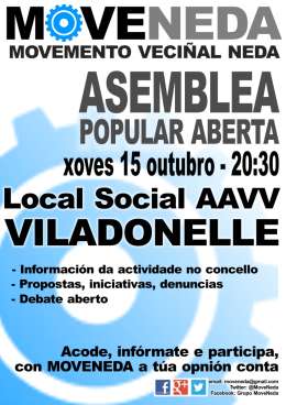 Celebrouse ontes dia 15 de outubro a Asemblea Aberta convocada por MOVENEDA no local da AAVV de Viladonelle. Asistiron una vintena de veciños que exp...