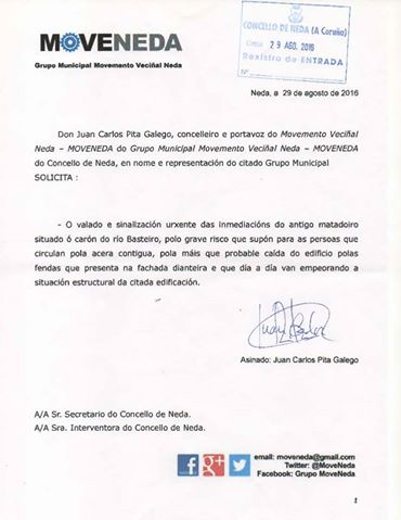 MOVENEDA ven de presentar hoxe por rexistro un escrito solicitando o valado urxente do matadoiro do Basteiro ata a sua demolicion, polo perigo de desp...