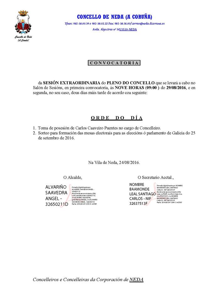 Convocase PLENO EXTRAORDINARIO pra este vindeiro luns Dia 29 de agosto as 9 da maña, no salon de plenos do Concello. Ademais do sorteo das mesas electorais para as elecccions autonomicas tomara posesion Carlos Caaveiro como concelleiro de MOVENEDA en sustitucion de Leticia Iglesias.