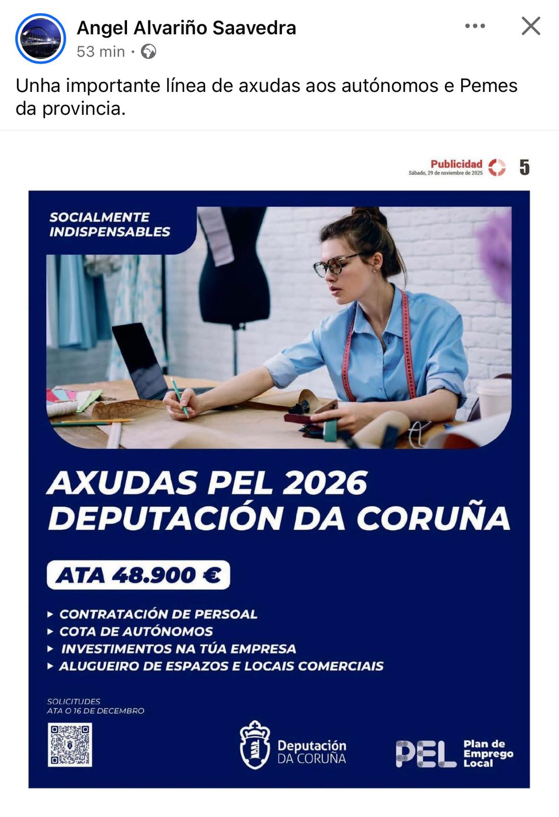 O sábado 29 de novembro o alcalde anunciou nas súas redes sociais privadas e nas do seu partido político axudas e subvencións da Deputación da Coruña. O grave é que o fixo antes de que esa información estivese dispoñible nos canais oficiais municipais.