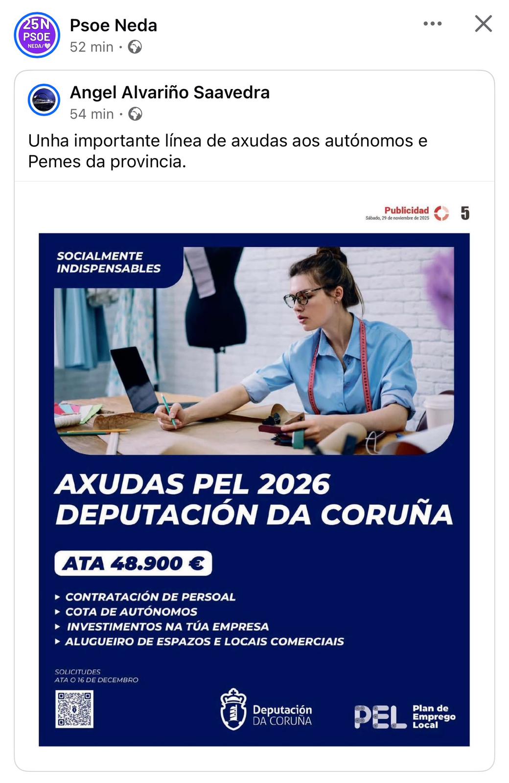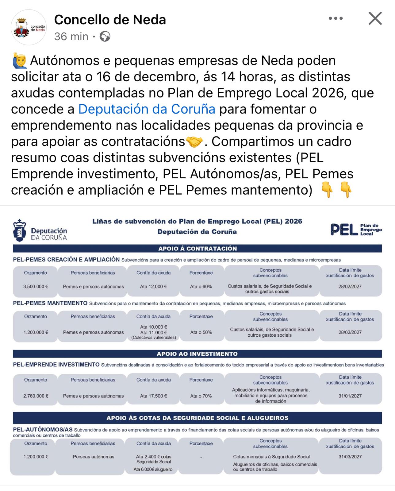 Este xeito de proceder evidencia unha triste realidade: os autónomos, pequenos empresarios e profesionais de Neda non están no centro das preocupacións do alcalde. Se realmente o estivesen, o primeiro lugar onde se comunicarían estas axudas sería nos espazos oficiais do Concello, garantindo que toda a cidadanía tivese acceso inmediato e en igualdade de condicións á información, con tempo suficiente para presentar documentación. Con este proceder, os que non seguen as redes do PSOE e de Ángel Alvariño xa perderon cinco días de prazo.