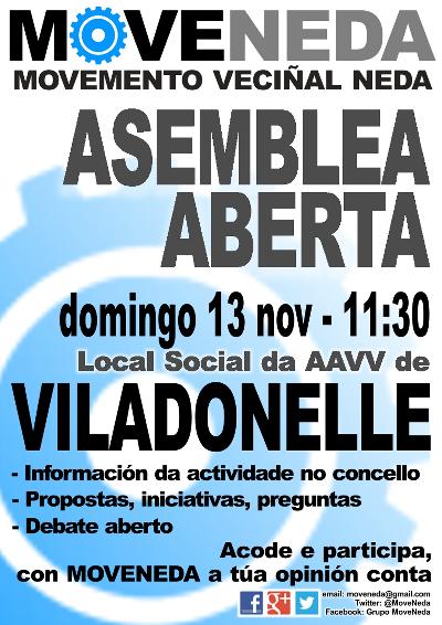 O vindeiro domingo 13 de novembro, as 11:30 horas, no local da Asociacion de Veciños de Viladonelle, continuaremos co proceso habitual de Asambleas Abertas co que MOVENEDA tenta impulsar a informacion directa e a participacion dos veciños.