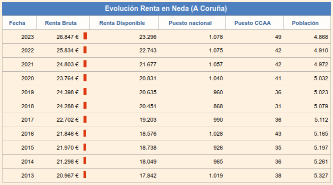 Tamén cabe destacar a evolución histórica: nos últimos anos a renda bruta media de Neda subiu de maneira constante, pasando de 24.803 €/ano en 2021 a 26.847 € en 2023. Este crecemento local, aínda que positivo local, queda tamén por baixo das medias autonómicas e estatais.