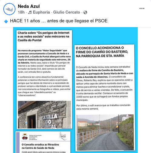 A conta semi-oficial do Partido Popular de Neda no Facebook, Neda Azul fachenda de xeito nostálxico nunha publicación das "moitas cousas que se facian" no Concello cando eles gobernaban. Pero...