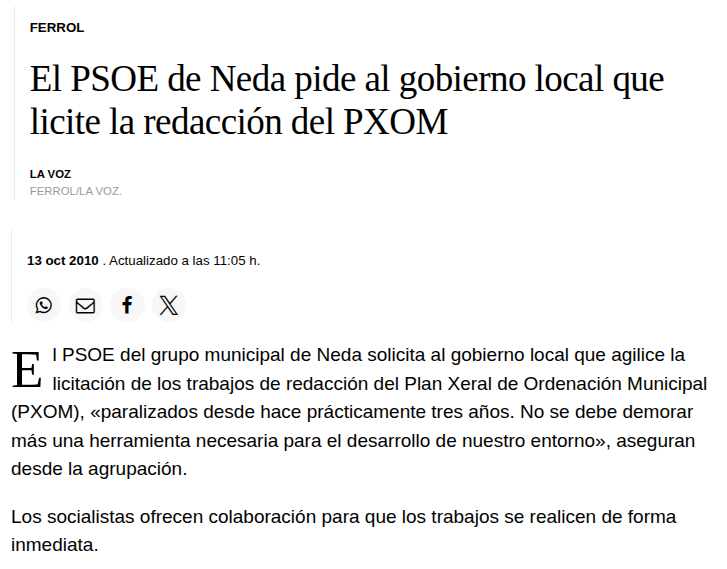 É necesario lembrar que daquela en 2014 o PSOE se abstivo na votación da aprobación inicial do PXOUM. Todos sabemos que o PSOE na oposición se comporta de xeito distinto a cando goberna, como este exemplo: El PSOE de Neda pide al gobierno local que licite la redacción del PXOM