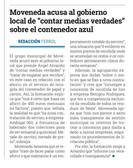 O Diario de Ferrol se fai eco na súa edición en papel da nosa nota de prensa onde desmentimos as afirmacións do Concello de Neda sobre o suposto aforro no servizo de reciclaxe de cartón e papel.