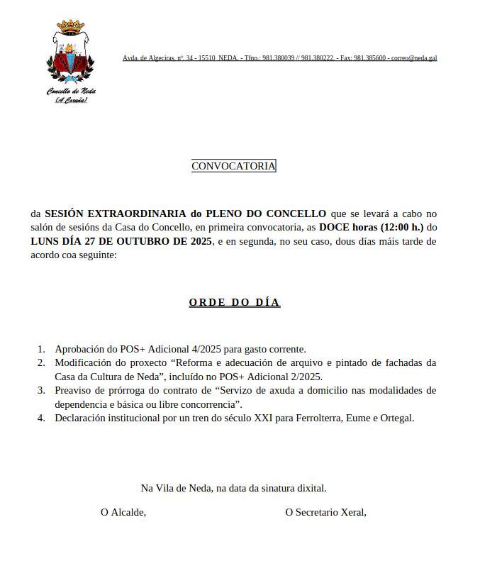 O alcalde ven de convocar Pleno Extraordinario do Concello para o vindeiro lúns, día 27 de outubro as 12:00 horas. Será no salón de sesións da Casa do Concello