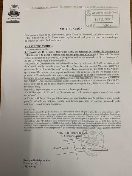 O curioso deste caso e que, dende o o dia 5 de novembro ate o 3 de decembro, a empresa amiga do goberno municipal, Vázquez Garzón, si puido facer a recollida e a descarga en Recinor xa que SI contaban coa totalidade da documentación requerida e facilitada puntualmente polo concello.
