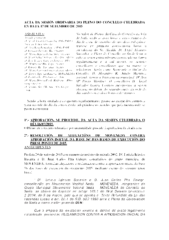 ACTA DA SESION EXTRAORDINARIA LEVADA A CABO O DIA 13 DE XUÑO DE 2015 PARA CONSTITUCIÓN DA NOVA CORPORACIÓN ELEXIDA NAS ELECCIÓNS CELEBRADAS O DIA 24 DE MAlO DOS CORRENTES ASI COMO ELECCIÓN E TOMA DE POSESIÓN DO ALCALDE ELEXIDO. No Salón de Sesións da Casa do Concello de NEDA, sendo as once horas e tres minutos do día trece de xuño do ano dous mil quince e dando cumprimento ao disposto polos artigos 195 e 196 da Leí orgánica 5/1985, do 19 de xuño, do Réxime Electoral X eral e artigos 37 e seguintes do Regulamento de organización, funcionamento e réxime xurídico das Entidades locais aprobado por R.D. 2568/86 do 28 de novembro, celébrase sesión pública para a constitución da nova Corporación municipal resultante das eleccións celebradas o dia 24 de maio dos correntes, a cal foi convocada regulamentariamente según orde do día circulada ós novos concelleiros/as elixidos coa antelación e formalidades esixidas. Atópase sobre da mesa comunicación da Xunta Electoral de Zona trasladando acta de proclamación de Concelleiros/as electos neste Concello e que son os seguintes: