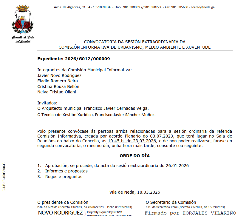 O venres 20 tamén recibimos convocatoria extraordinaria da Comisión Informativa de Urbanismo, Medio ambente e Xuventude, para o mesmo luns ás 10:45 e presidida polo concelleiro Javier Novo.