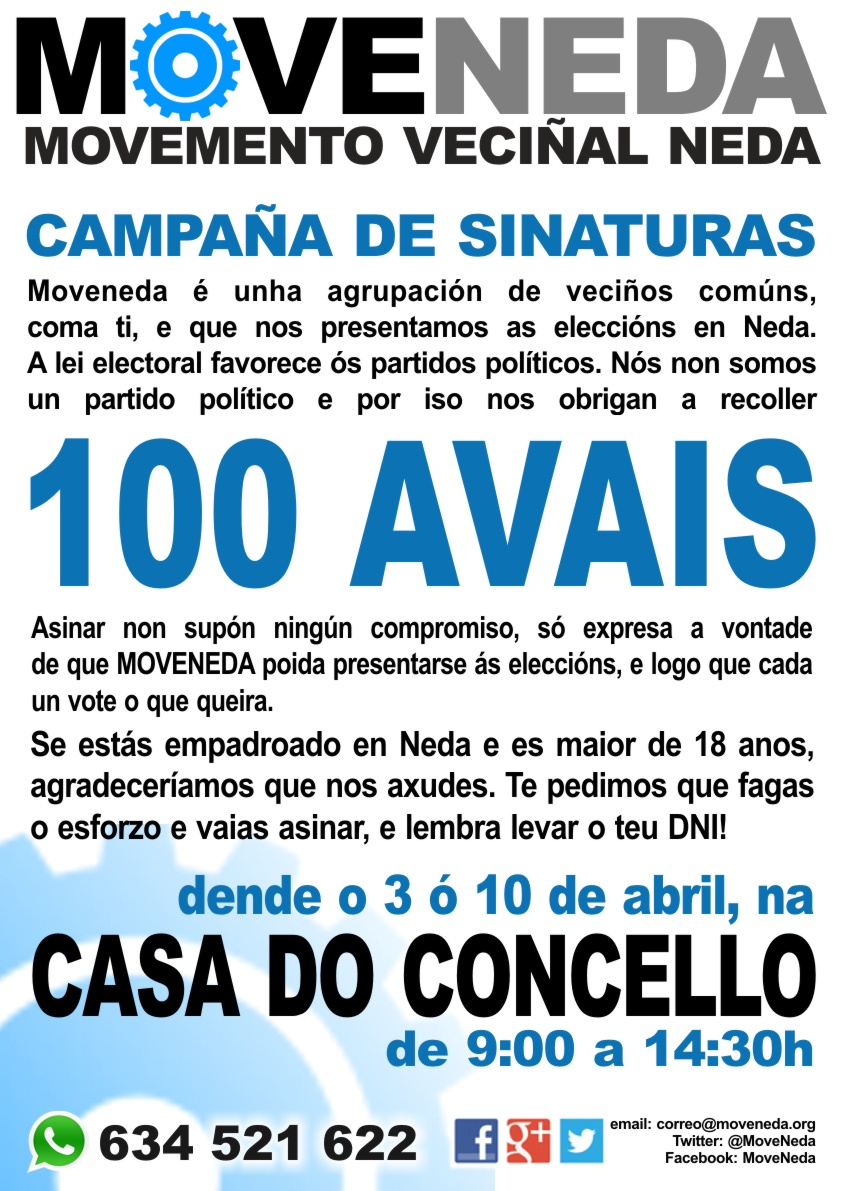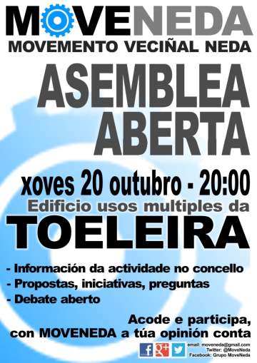 Movemento Veciñal de Neda - Moveneda Moveneda é unha iniciativa política municipalista, popular, de base, de veciños comúns, aberta, participativa e asamblearia. O noso obxetivo e informar, concienciar e fomenta-la participación política de todos os veciños nas decisións do concello. Somos veciños comúns de Neda que presentamos unha alternativa “a medida para Neda”, cunha mirada realista e comprometida, pensada para afrontar e solucionar os problemas e para potenciar as vantaxes do municipio. Pensamos que en un concello como Neda pode funcionar millor un modelo onde prime a colaboración do Goberno do Concello, as Asociacions de Veciños e os propios veciños. Esta é a millor garantía dun proxecto autónomo, colectivo, á medida de Neda e as necesidades que temos como veciños.