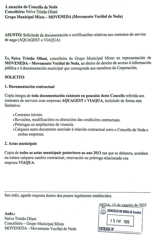 MOVENEDA rexistrou no concello duas solicitudes de informacion. A primeira delas referida aos contratos e a documentacion adicional dos Concello de Ne...